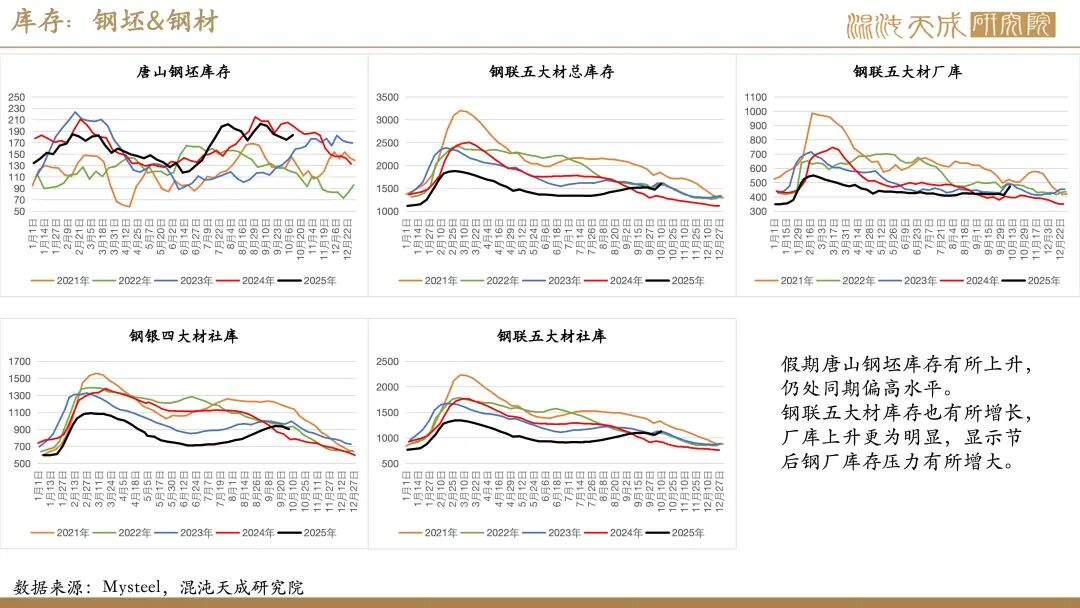 库存:假期疏港下降至327万吨,45港铁矿库存小幅上升24.22万吨至14024.22万吨,铁矿总库存也小幅增长,但废钢库存略有下降。节后唐山钢坯库存有所增长,五大材及五大材以外厂库均有明显上升,社库也有所增长,整体钢材库存压力增大。