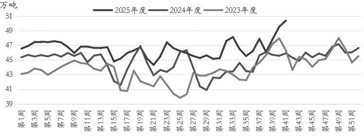供应压力进一步加剧。钢联数据显示,截至10月10日当周,PVC综合产能利用率为82.63%,环比上升1.21个百分点,同比提高3.6个百分点。近年来,新增产能陆续释放,推动PVC总产能基数大幅上升。在开工率与产能双升的背景下,PVC周度产量攀升至50.36万吨,创近3年新高,环比增长1.68%,同比增长近10%。从工艺结构看,乙烯法装置开工率提升尤为明显,产量显著增加。