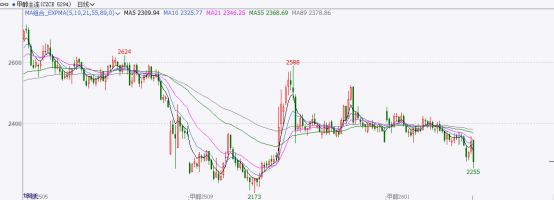 截至前一个交易日收盘,甲醇走弱,收阴线。受贸易战影响,商品普遍下跌。