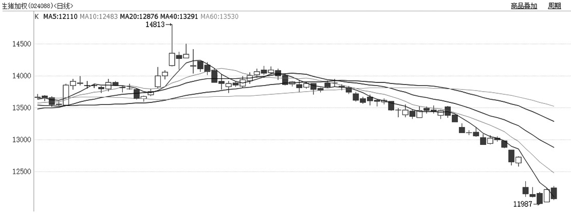 生猪加权在上周低开低走,再创上市以来新低。本周持仓量创出历史新高,成交较为活跃,价格有所止跌。这说明多空争夺激烈,但整体依旧是空头占据主导地位。均线系统呈现空头排列,中长期下降趋势未改。MACD在零轴下方运行,绿柱小幅缩短。KDJ在超卖区间反复缠绕,但并未给出做多信号。综合来看,生猪跌势未止,维持空头思路。