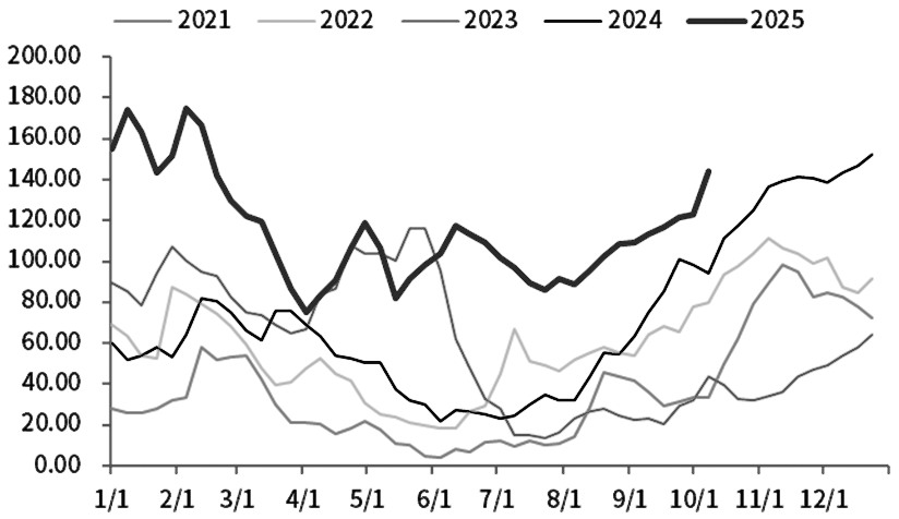 此外,针对近期尿素价格的快速下跌,中国氮肥工业协会发布了四季度尿素出厂指导价。以河南小颗粒尿素为例,2025年10月至2026年3月的出厂指导价分别为1660元/吨、1690元/吨、1720元/吨、1750元/吨、1780元/吨、1810元/吨,呈现阶梯上升的特点。其中,10月指导价较当前市场价格高出150元/吨左右,政策托底意图明显,但缺乏实操性。从企业行为看,山东华鲁恒升、河南心连心等大厂均以随行就市为主,近日出厂价虽有上调,但也是需求端补仓的结果,可见厂家仍多根据自身产销情况调整价格。尿素厂内库存攀升至144.39万吨的高位,高库存短期内难以去化,将持续压制价格上行空间。