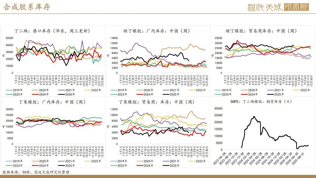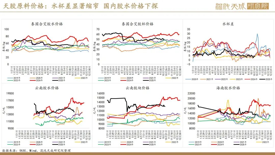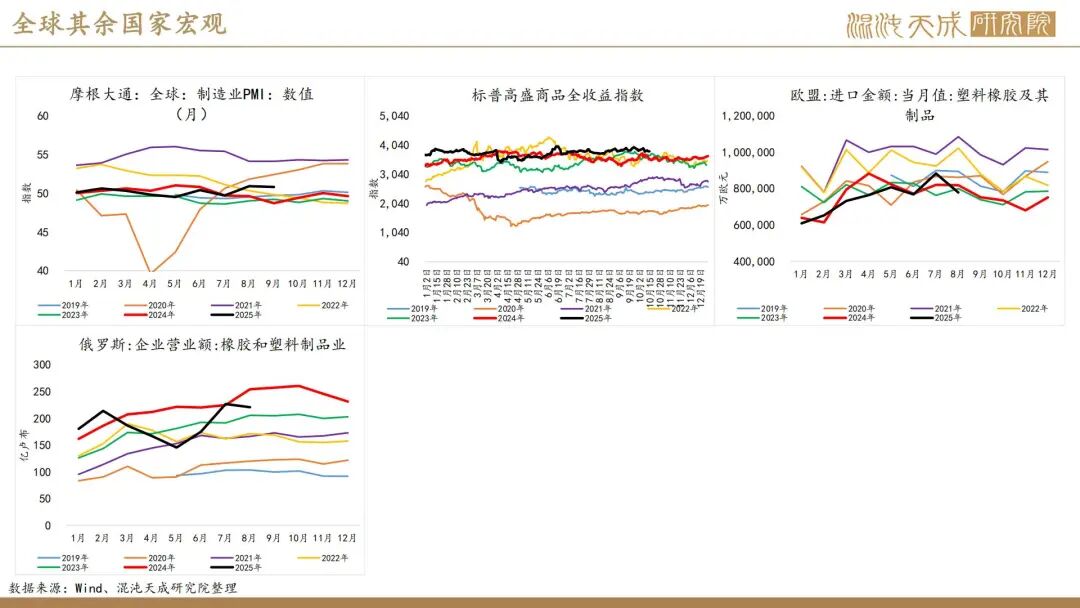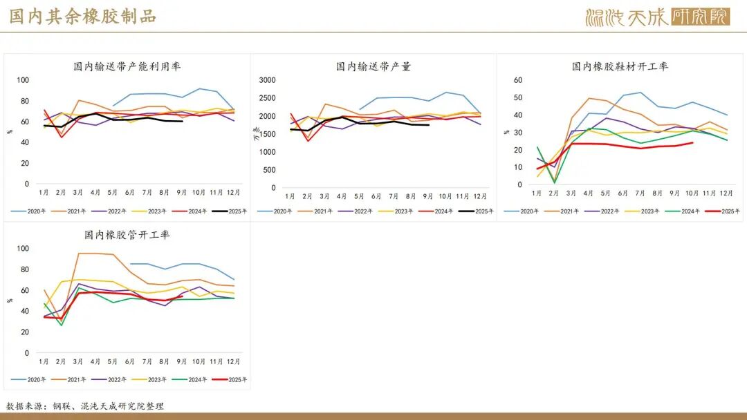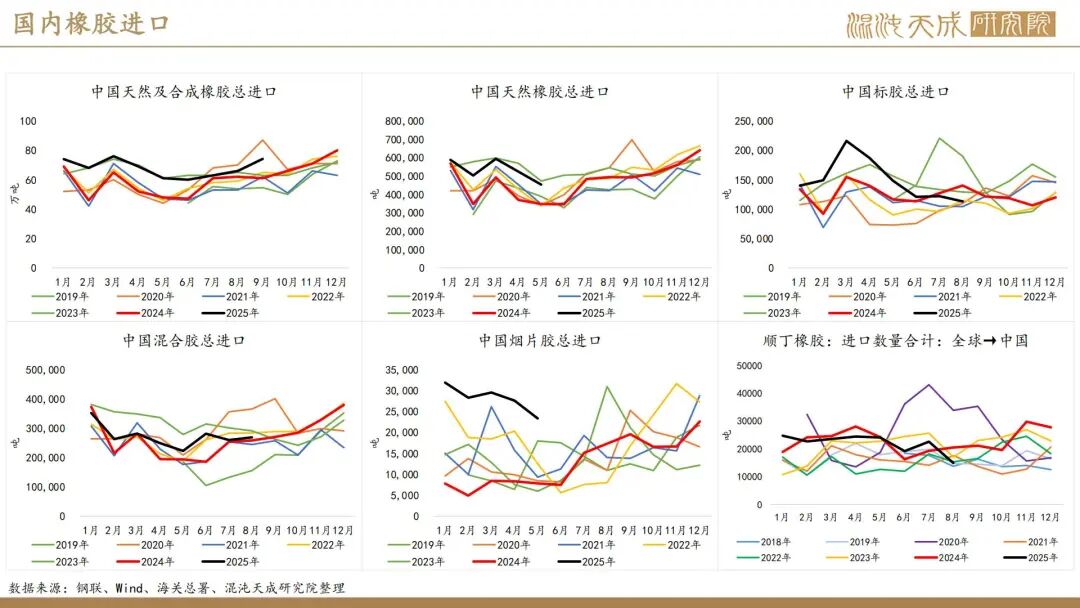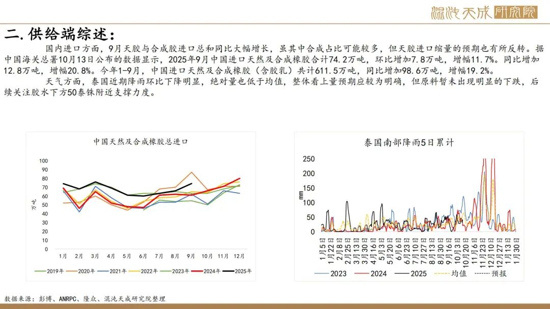 国内进口方面,9月天胶与合成胶进口总和同比大幅增长,虽其中合成占比可能较多,但天胶进口缩量的预期也有所反转。据中国海关总署10月13日公布的数据显示,2025年9月中国进口天然及合成橡胶合计74.2万吨,环比增加7.8万吨,增幅11.7%。同比增加12.8万吨,增幅20.8%。今年1-9月,中国进口天然及合成橡胶(含胶乳)共计611.5万吨,同比增加98.6万吨,增幅19.2%。