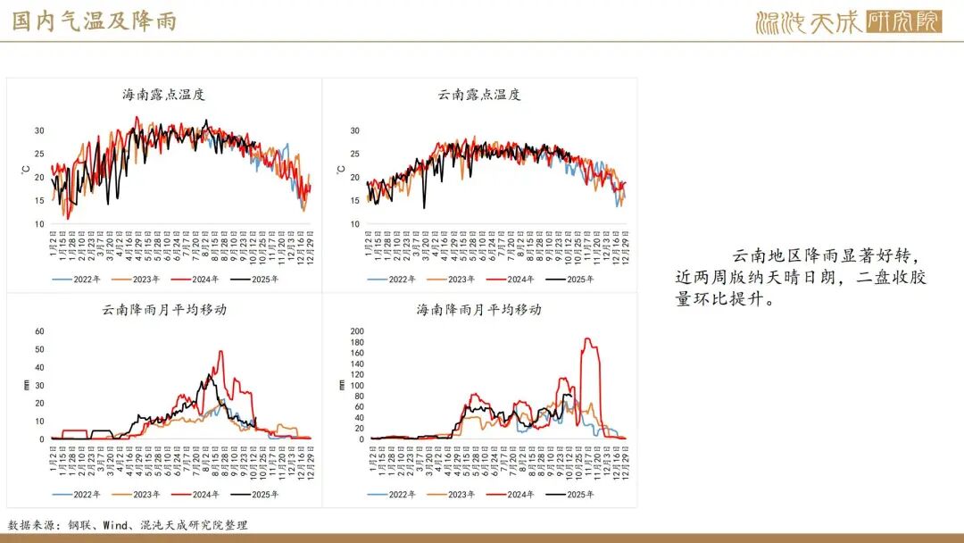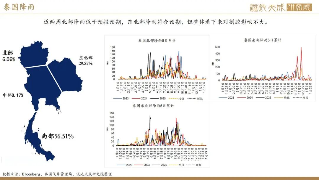 天气方面,泰国近期降雨环比下降明显,绝对量也低于均值,整体看上量预期应较为明确,但原料暂未出现明显的下跌,后续关注胶水下方50泰铢附近支撑力度。