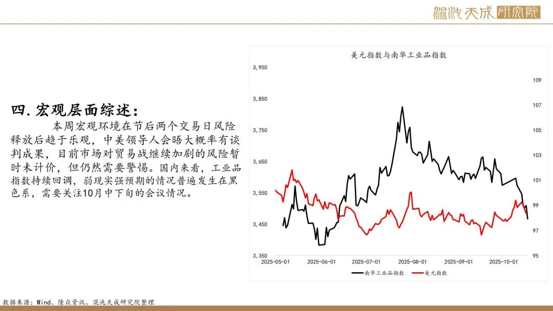 本周宏观环境在节后两个交易日风险释放后趋于乐观,中美领导人会晤大概率有谈判成果,目前市场对贸易战继续加剧的风险暂时未计价,但仍然需要警惕。国内来看,工业品指数持续回调,弱现实强预期的情况普遍发生在黑色系,需要关注10月中下旬的会议情况。