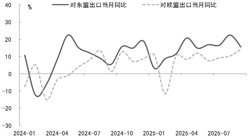 图为我国对东盟和欧盟出口当月同比走势