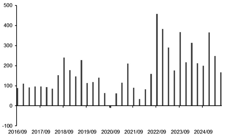 黄金ETF方面,世界黄金协会数据显示,2025年9月全球黄金ETF实现145.6吨的净流入,单月规模仅次于2022年3月俄乌冲突爆发和2020年疫情期间的历史性购金潮,总持仓量升至3837.7吨。其中,中国市场方面,随着9月金价持续走强及全球避险情绪再度升温,中国黄金ETF净流入5吨,持仓规模逐步回升至193.7吨。