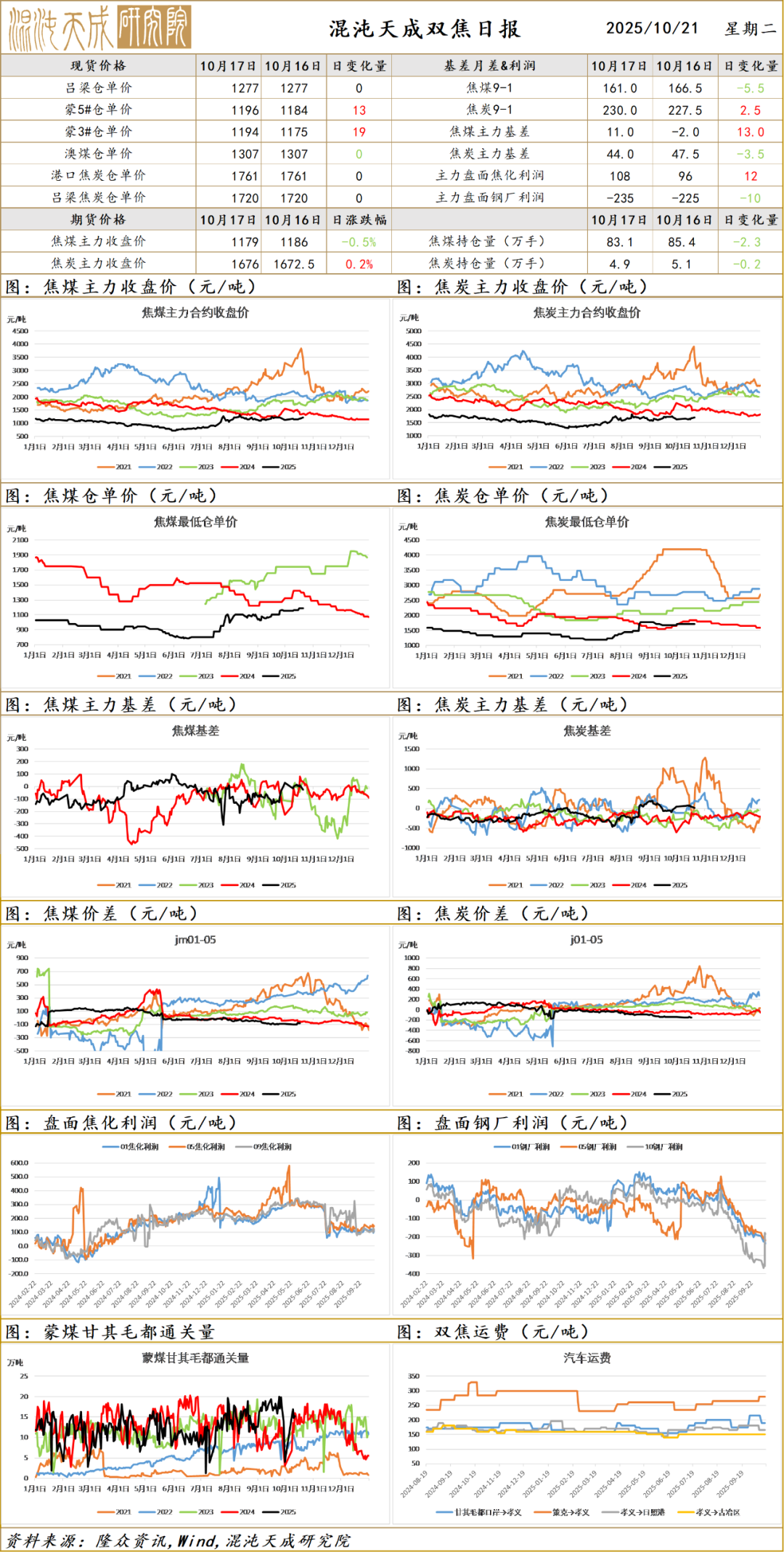 2.中国煤炭资源网冶金部10月20日重点关注:焦炭市场继续偏强运行,随着煤价上涨范围逐渐扩大,焦企利润继续被压缩,西北区域以及部分顶装焦化企业已经亏损,因亏损减产现象预计会逐步增多,个别因环保以及产能限制开工小幅下滑,焦炭整体产量稳中有降。需求方面,钢厂考虑当前高炉仍处于高开工高日耗状态且自身原料库存不高,采购积极性尚可,对本轮提涨尚在博弈中。整体看,当前焦炭供需矛盾稍有加大,在原料上涨支撑下焦炭表现偏强,需继续关注高炉铁水变量以及煤价走势。焦煤方面,受环保和煤矿换工作面等因素影响,山西和内蒙古地区部分煤矿有停限产情况,国内炼焦煤供应相对偏紧。需求方面,近期下游钢焦企业开始适当补库,且随着市场情绪好转,部分贸易商有进场采购现象,煤矿订单情况良好,价格普遍出现上涨,目前各煤种价格上涨30-50元/吨左右,部分竞拍资源涨幅在100元/吨以上。进口蒙煤方面,近两日甘其毛都口岸通关有所回升,不过口岸现货可售资源仍较少,叠加期货盘面反弹,口岸贸易商报价坚挺,今日蒙5#原煤报价1100-1120元/吨左右。