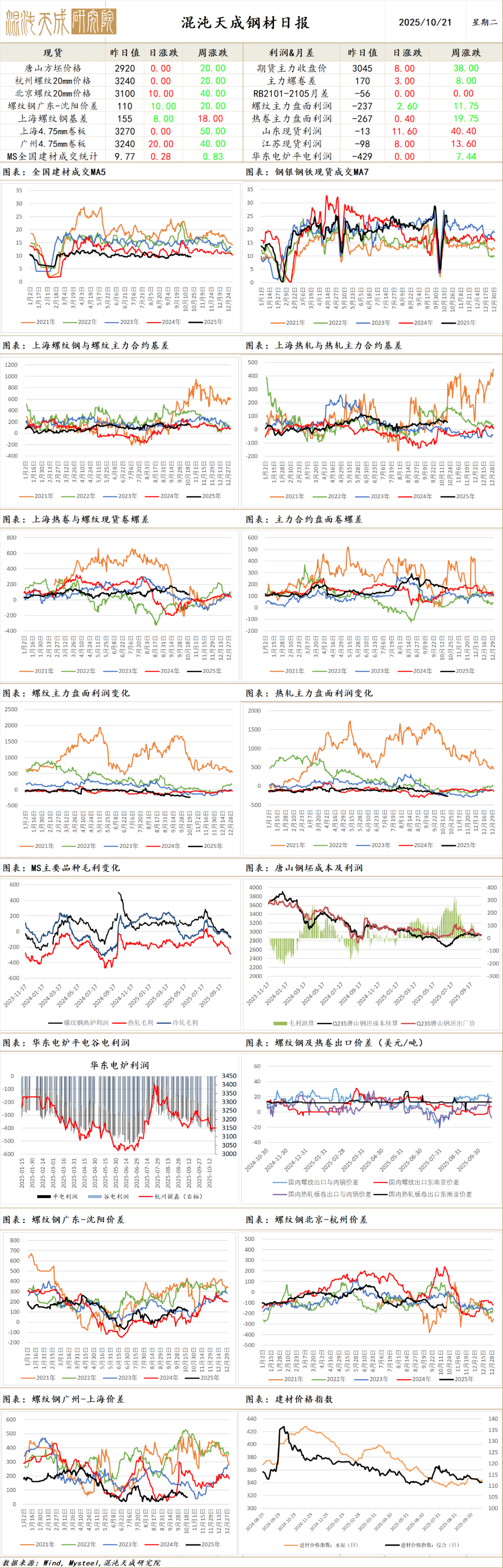 需求端,周一钢银城市钢材库存略有下降,其中建材库存减少,但热卷库存有增。上周钢联五大材厂库、社库均有减量,总库存有小幅下降,而找钢的钢材厂库、社库延续增长,但总库存增幅有所放缓。不过,上周机构数据均显示钢材表需有明显回升。另据百年建筑调研,上周全国水泥出库量252.85万吨,环比上升7.7%,基建水泥直供量环比上升4%;混凝土发运量为149.68万方,环比增加3.04%;样本建筑工地资金到位率59.44%,周环比减0.1个点,显示当前建筑下游需求依然喜忧参半。海外方面,美国政府停摆延续,美债规模继续上升,叠加中美贸易博弈不确定性仍存,近期贵金属持续走强,外盘商品走势大幅波动。国内方面,昨日宏观数据显示9月国内地产基建依然较差,制造业投资也有所走弱,但出口和消费保持韧性,4.8%的GDP也基本符合预期,不过与黑色相关的地产、制造业需求均偏弱。进出口方面,东南亚、印度钢价有小幅走弱,国外其它地区钢价依然持稳,但因国内钢价也继续下跌,目前国内外冷热卷价差小幅扩大,国内钢材出口空间趋增。