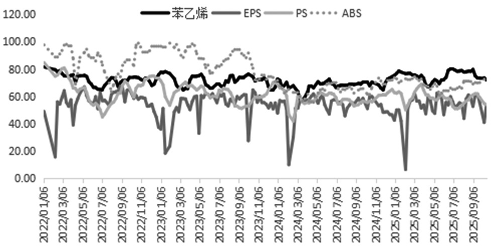图为苯乙烯及苯乙烯三大下游开工负荷(单位:%)