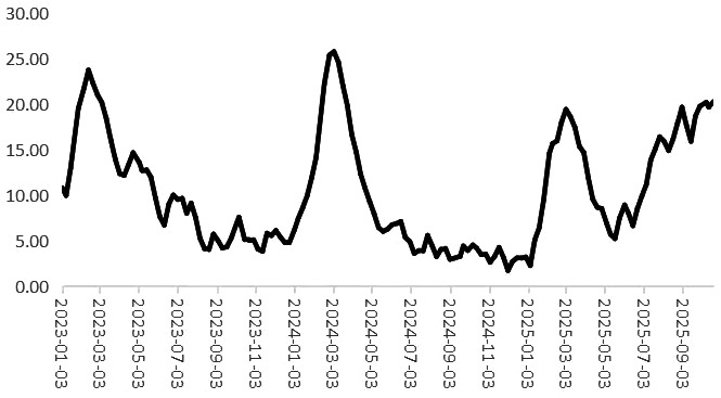 图为华东地区苯乙烯港口库存走势(单位:万吨)