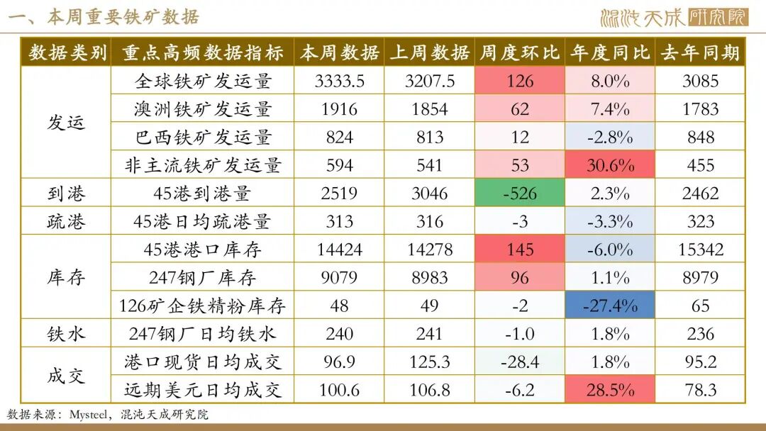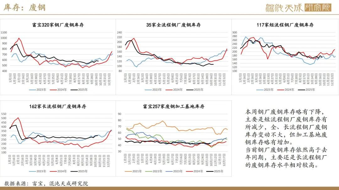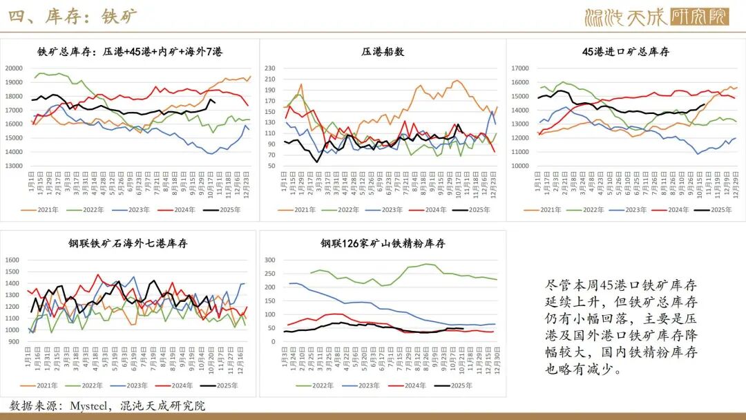 库存:本周疏港继续下降至312.65万吨,45港铁矿库存上升145.32万吨至14423.59万吨,但铁矿总库存因压港缓解有所下降,同期废钢库存也略有减量。尽管唐山钢坯库存小幅上升,但五大材及五大材以外钢材厂库、社库均有不同程度减量,整体钢材库存略有减少。