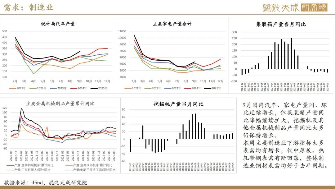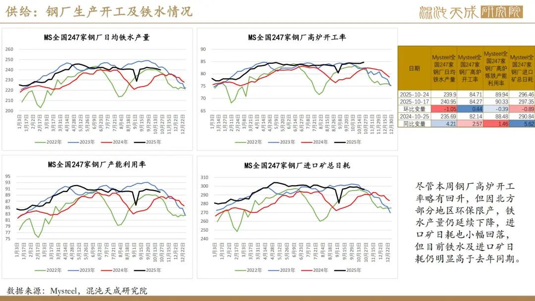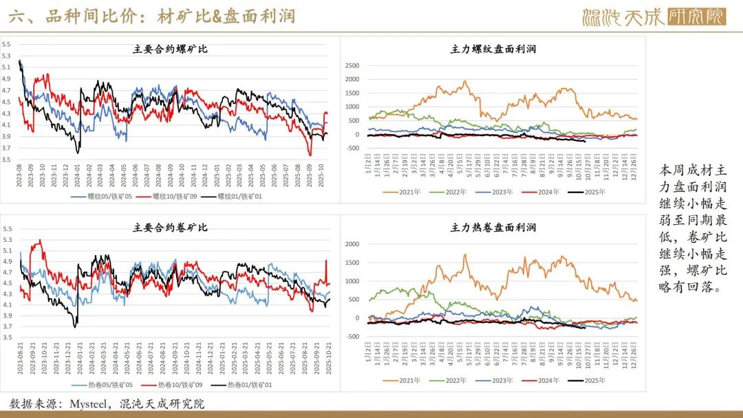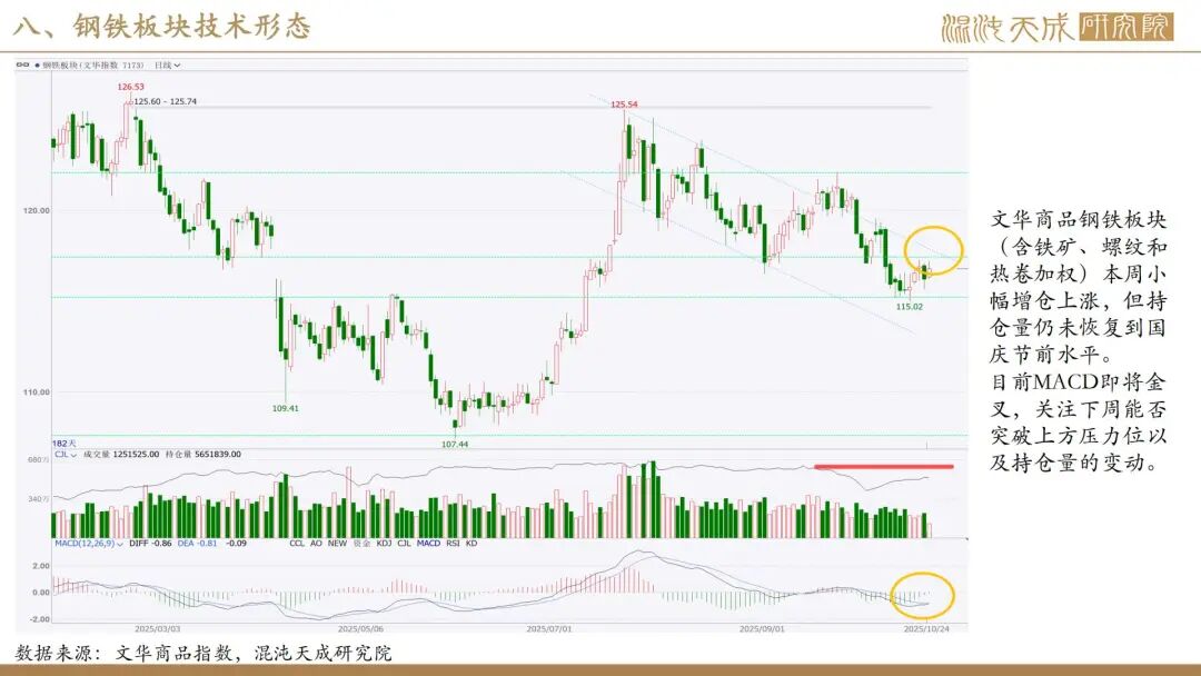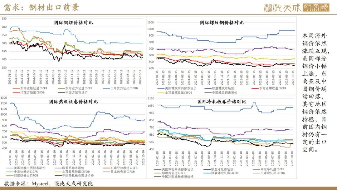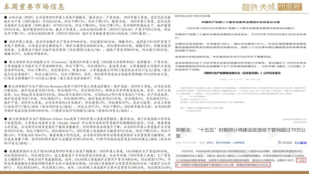 宏观:随着新一轮经贸磋商的开启,短期中美博弈有所缓和,关注月末APEC会议高层是否会面。本周国内四中全会落幕,公告内容符合预期,周五新闻发布会上发改委领导表示“十五五”时期预计将建设改造地下管网超过70万公里,新增投资需求超过5万亿元,并强调将综合整治“内卷式”竞争,有力有效破除各种市场障碍,国内宏观预期向好。此外,本周工信部发布的《钢铁行业产能置换实施办法(征求意见稿)》显示钢铁行业长期供应格局预期趋减,整体钢铁业中长期供需格局有望改善。