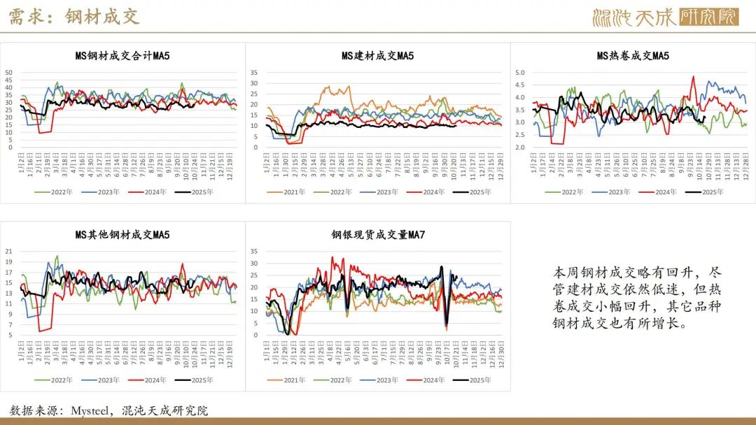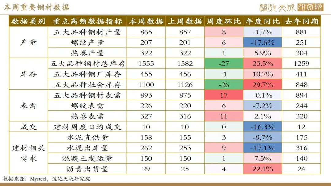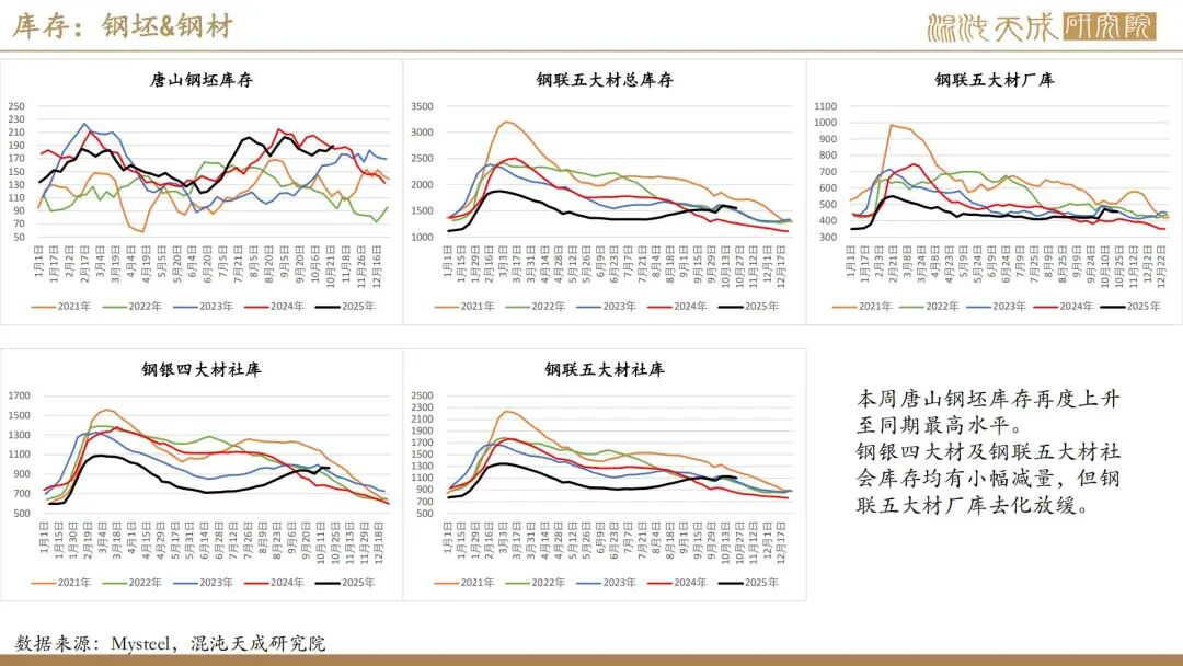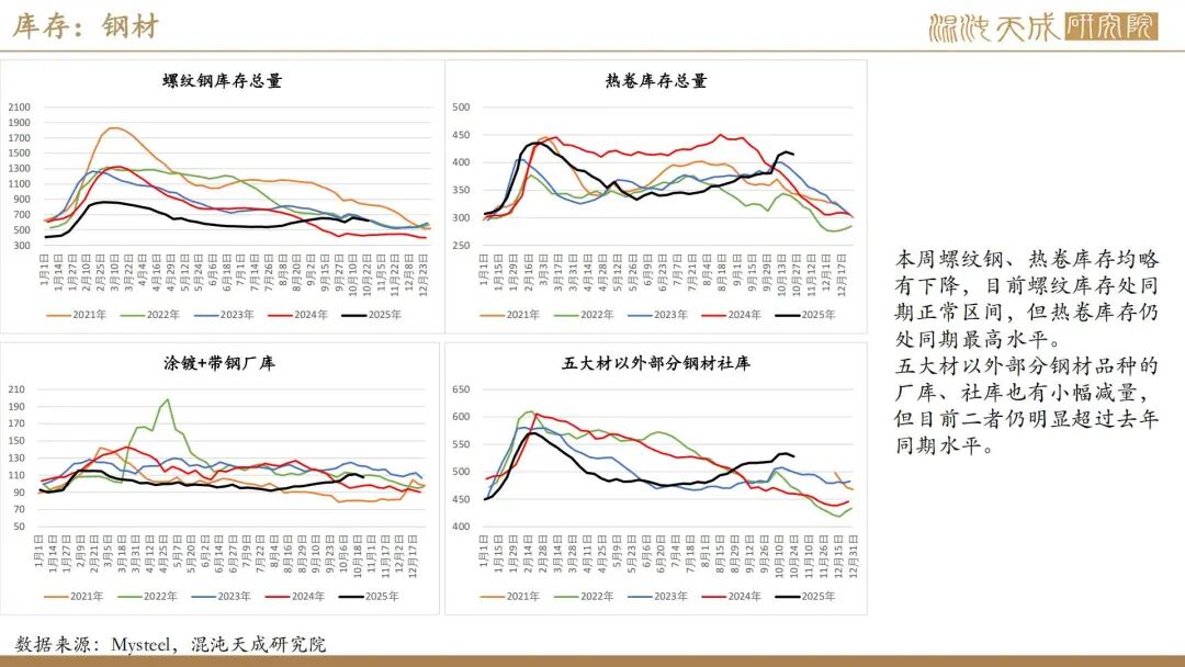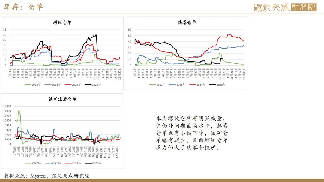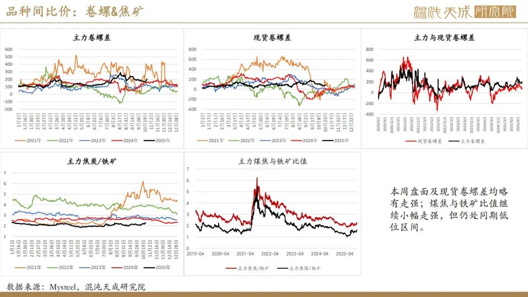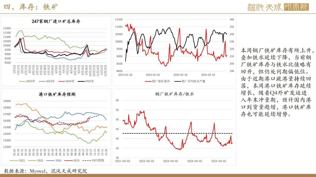 宏观:随着新一轮经贸磋商的开启,短期中美博弈有所缓和,关注月末APEC会议高层是否会面。本周国内四中全会落幕,公告内容符合预期,周五新闻发布会上发改委领导表示“十五五”时期预计将建设改造地下管网超过70万公里,新增投资需求超过5万亿元,并强调将综合整治“内卷式”竞争,有力有效破除各种市场障碍,国内宏观预期向好。此外,本周工信部发布的《钢铁行业产能置换实施办法(征求意见稿)》显示钢铁行业长期供应格局预期趋减,整体钢铁业中长期供需格局有望改善。