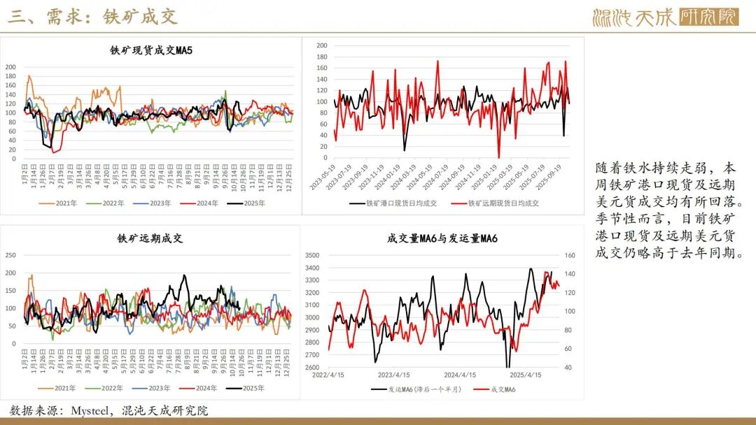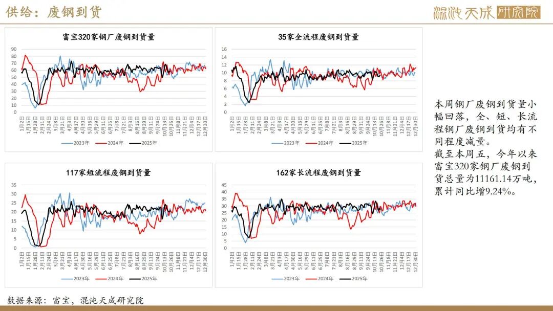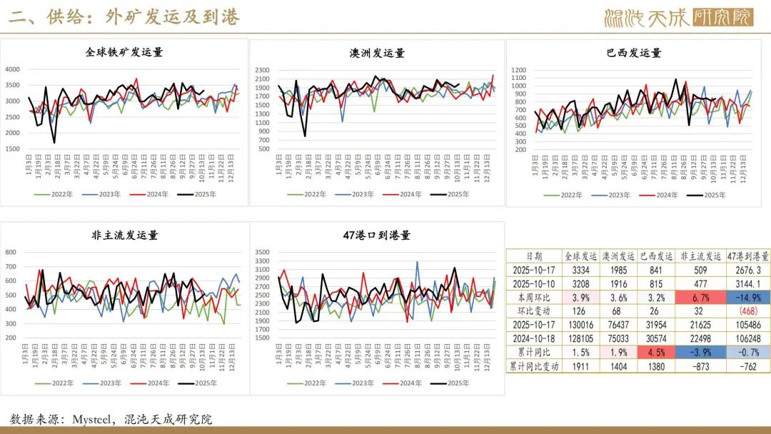 供给:尽管近期港口铁矿到货大幅下降,但随着全球铁矿发运回升,叠加年末即将进入外矿发运冲量,预计后期国内进口矿到港趋增。9月国内原矿产量环比增3.2%,但钢联铁精粉产量变动不大,本周国内矿产量依然持稳,废钢到货量略有回落,整体铁元素供应偏稳。不过,随着铁水产量和废钢日耗的下降,本周粗钢供应略有回落。