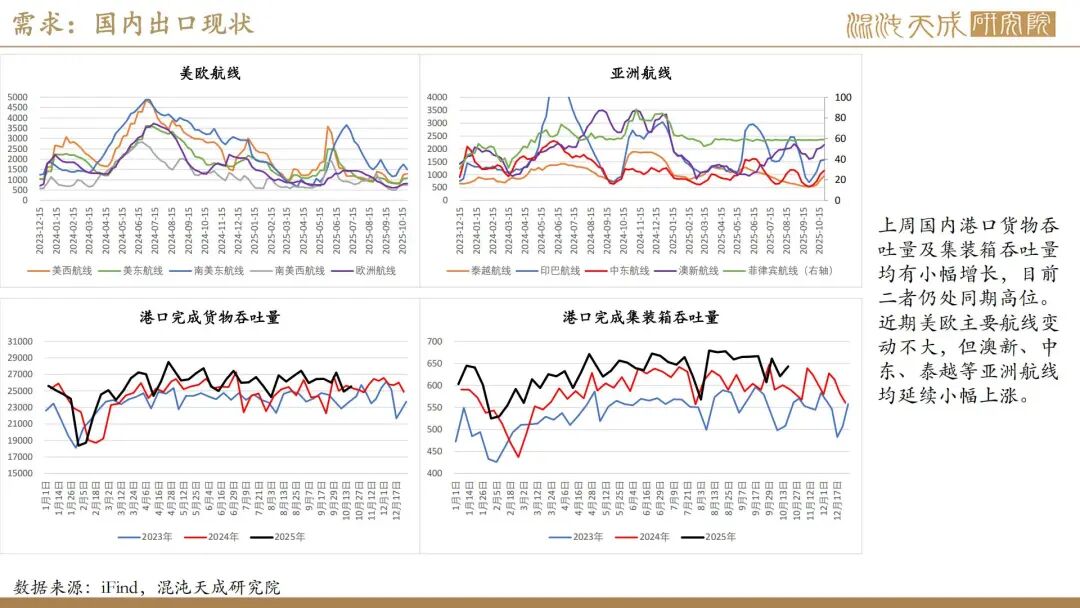 需求:9月经济数据显示国内地产、基建依然低迷,制造业虽保持韧性,但投资增速下降,仅出口仍维持强劲。本周建筑业及制造业下游高频指标大多继续表现回升,仅个别钢材表需有小幅回落。近日海外钢价依然涨跌互现,美国部分钢价小幅上涨,东南亚及中国钢价延续回落,其它地区钢价持稳,国内钢材仍有一定出口空间。此外,近期国内港口货物及集装箱吞吐量再度回升,二者仍处同期高位,叠加亚洲航线延续小幅上涨,预计国内商品出口仍将保持韧性。