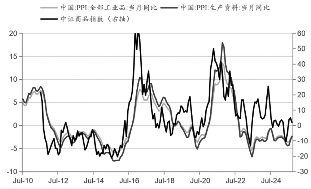 2025年上半年,受外部重大事件冲击,中证商品指数同比序列在4月至5月快速深度调整。这一冲击随后传导至实体经济,6月至7月全国PPI将加速下行。进入三季度后,市场出现积极变化:中证商品指数同比序列率先快速触底并强劲反弹。随后,PPI也同步企稳回升。这一数据变化表明,在经历上半年的脉冲式冲击后,在各项政策的呵护下,中国经济的内生修复动能正在增强,经济活动已步入稳步复苏通道。
