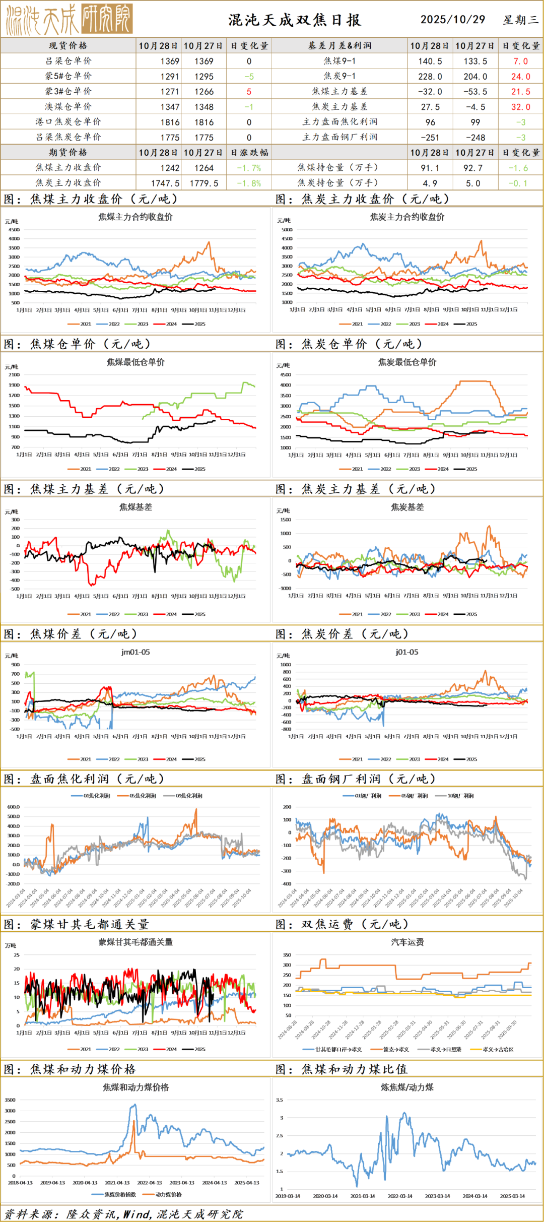 2.中国煤炭资源网冶金部10月28日重点关注:焦炭部分,焦炭第二轮涨价全面落地,累计涨幅100-130元/吨。落实本轮涨价后焦企亏损程度略有缓解,但近期产地焦企检修以及环保干扰被动减产的企业仍有增加趋势,供给端释放仍显困难。需求方面,随着河北地区环保升级,当地钢厂集中检修,本周高炉开工率下降较为明显,日耗降低,不过由于本次环保干扰时间较短,对原料影响有限。整体看,焦炭供需矛盾暂缓,短期市场持稳运行为主。焦煤方面,炼焦煤供给恢复缓慢,产地部分煤矿因搬迁工作面、减产等因素产量仍偏低。焦炭第二轮涨价全面落地,焦企利润稍有修复,煤矿订单良好,焦煤库存持续低位,预售较多叠加供应偏紧下,短期煤价支撑较强,价格延续涨势。进口蒙煤方面,甘其毛都口岸通关有所恢复,昨日通关1275车,因口岸可售资源较少,贸易商报价高位坚挺,蒙5原煤价格在1130-1140元/吨左右。