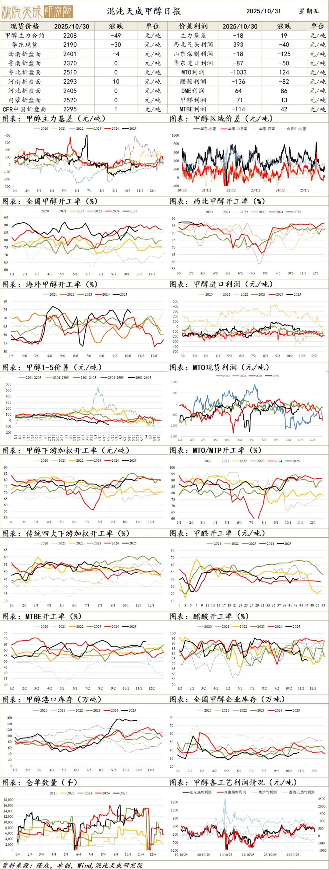 供给:国内开工回升。海外部分装置检修,但开工高位水平,目前预计10月130+,进口未受影响,只是因伊朗被制裁影响而到港下降,浮仓大幅增加,传伊朗大幅降价销售;冬季潜在利多是预计伊朗仍会提前限气影响进口。反内卷对甲醇真实影响暂不大,主要受煤支撑。