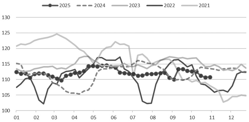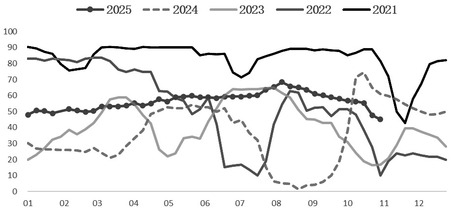 当前,尽管焦企盈利状况并未随着焦炭价格上行而改善,但其生产积极性尚可,焦炭供应高位趋稳。截至10月31日当周,钢联统计的全样本独立焦企焦炭日均产量为64.59万吨,产能利用率为73.44%,与9月中旬相比分别下降2.17万吨、2.48个百分点,整体仍处于相对高位。同时,钢联统计的247家钢厂焦炭日均产量为46.21万吨,连续两周回升;钢厂与焦化厂合计焦炭日均产量为110.80万吨,较前期高位下降2.27%,降幅有限,主要原因是下游钢厂补库和焦企出货情况尚可。