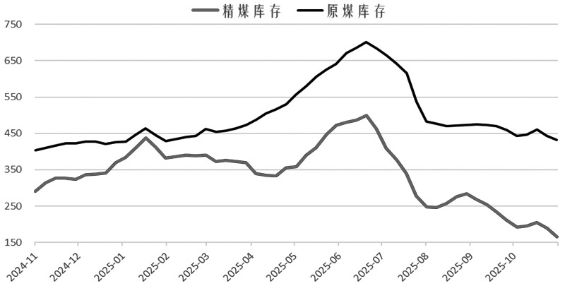 图为钢联统计的523家煤矿精煤和原煤库存(单位:万吨)