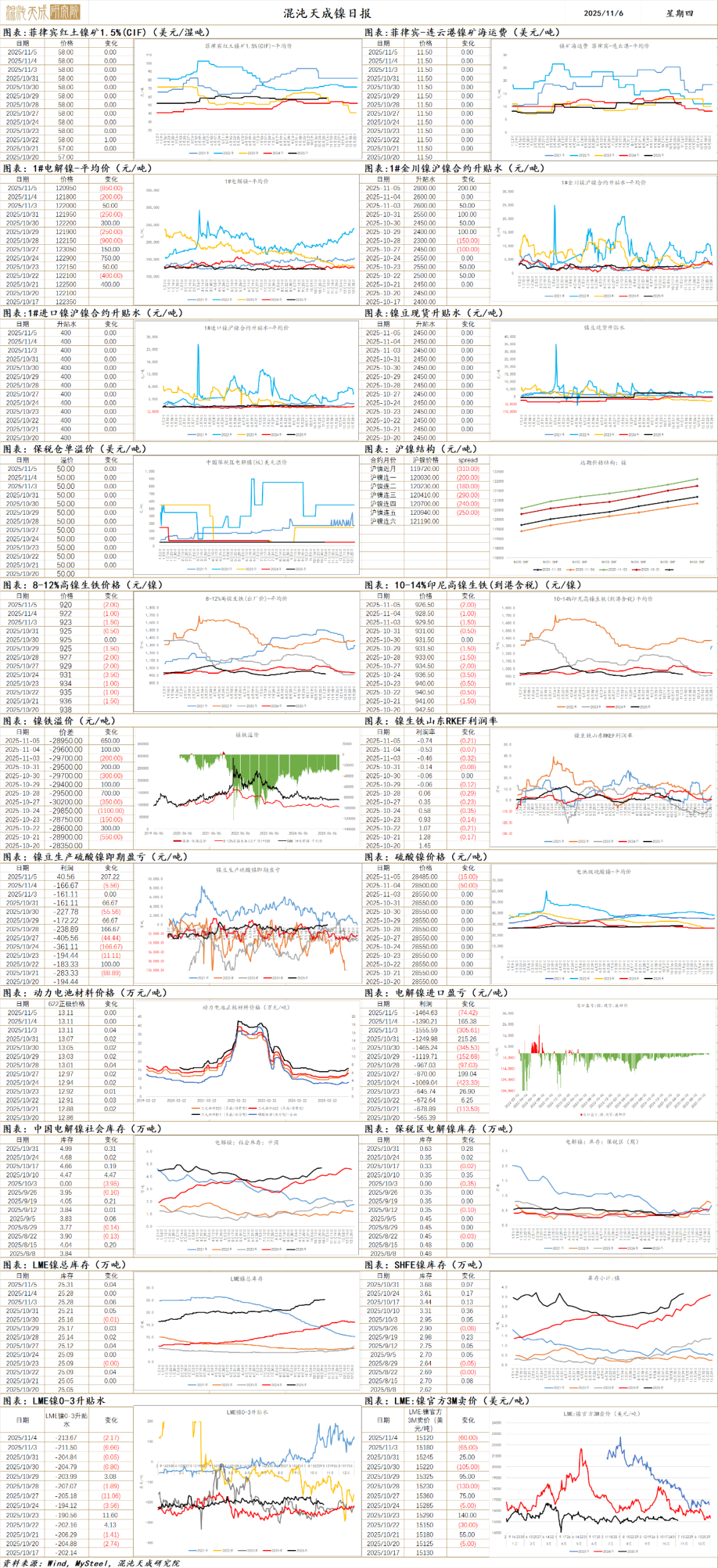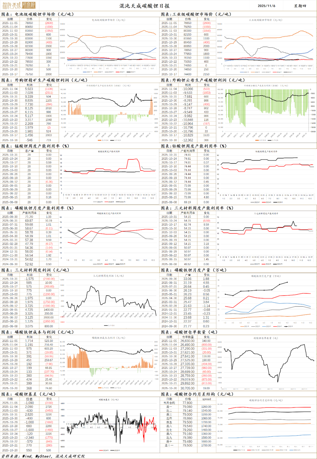昨日碳酸锂主力合约收盘价79140元/吨,涨跌幅-0.45%。主力合约持仓-4114至453260手,仓单+340至26830吨。现货方面,电池级碳酸锂报价-2600至78050元/吨,工业级碳酸锂报价-2600至76650元/吨。锂精矿均价-20至925美元/吨。