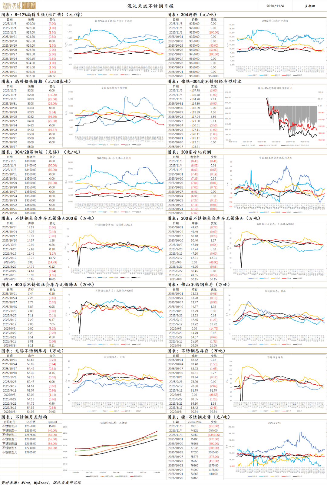 原料端,昨日印尼高镍生铁到港价-2至926.5元/镍点,当前镍铁现货供应充足,价格低位震荡。