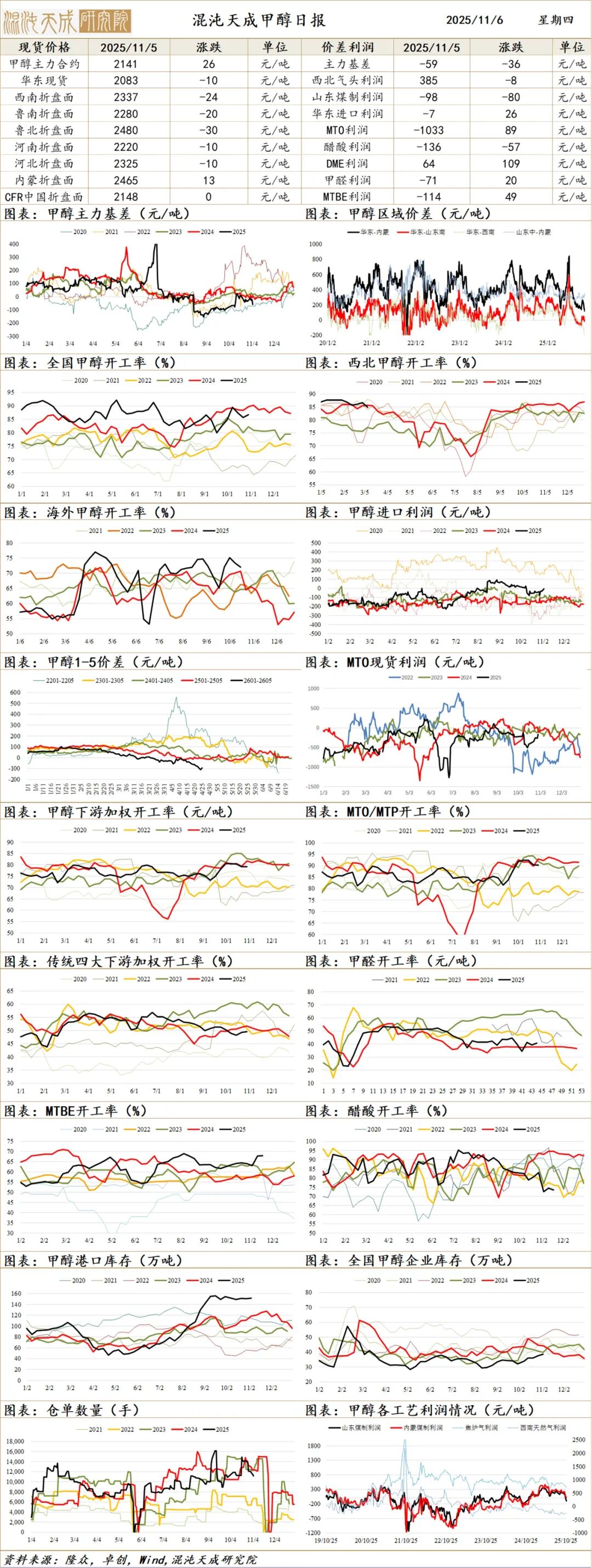 供应端:隆众数据,截止10.31日,开工微降至65.8%;利润较好开工偏高,裕龙80万吨10月投产。海外装置仍有异动,预计9-10月进口小幅缩量,后续进口小幅回升。