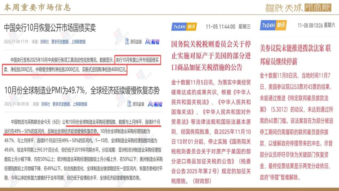 宏观:本周国内外宏观暂无重大事件,美政府停摆延续,10月全球制造业PMI仍在49.7%,显示全球经济恢复缓慢。不过,10月国内恢复公开市场国债买卖,净投放200亿元,显示国内货币政策有利好表现,叠加中美最新经贸磋商协议进入落实阶段,国内宏观预期依然向好。