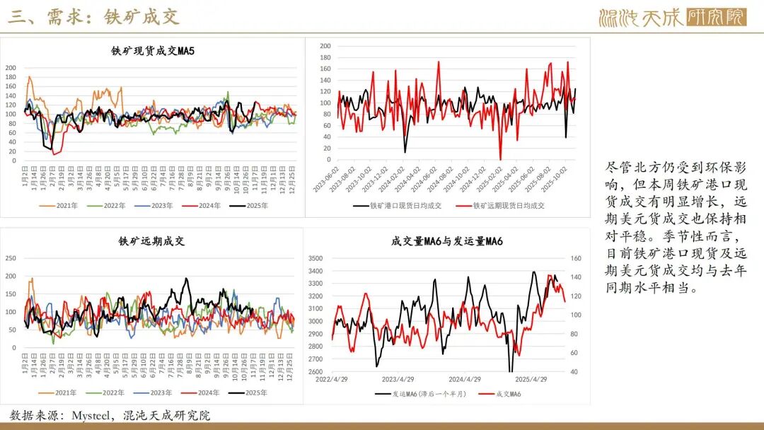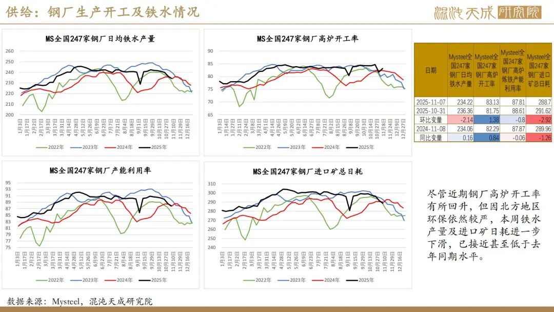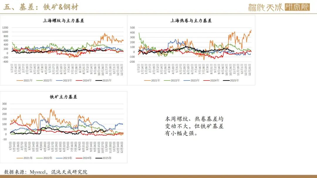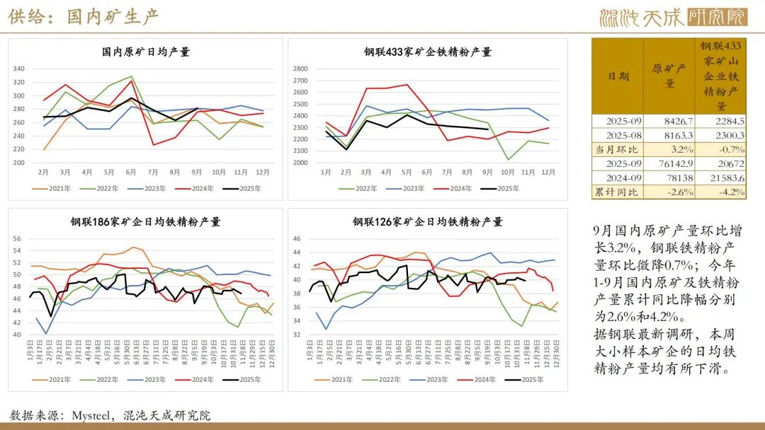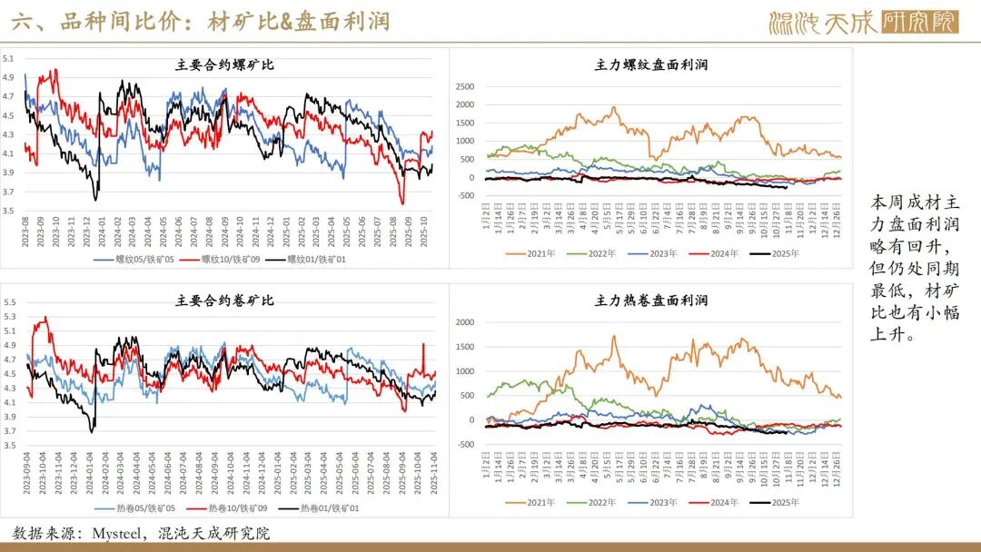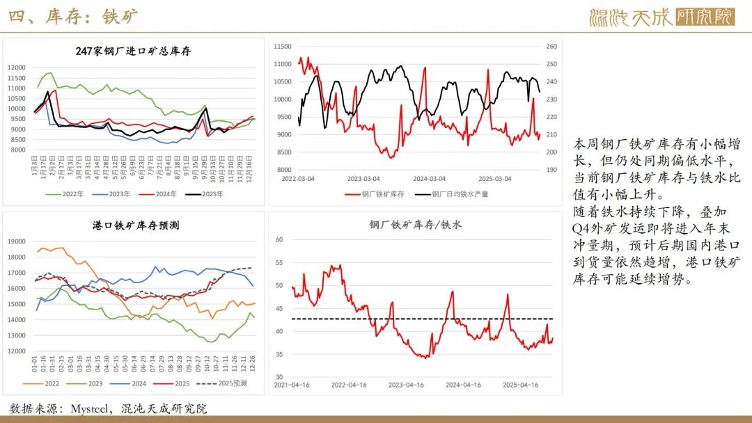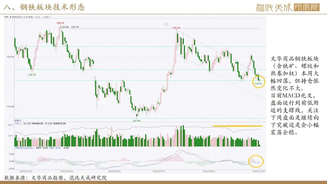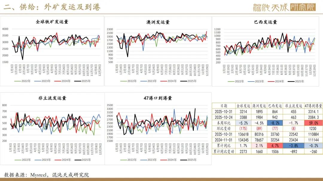 结论:随着10月一系列宏观重大事件落幕,国内外宏观预期整体向好的格局基本明确。不过,当前美国政府停摆延续,10月全球制造业PMI停滞不前显示全球经济恢复依然缓慢,短期海外市场不确定性引发市场担忧,但国内政策环境依然平稳向好,国内商品继续面临弱现实与强预期的博弈。考虑到11月宏观真空期,市场更倾向于交易弱现实,当前铁矿市场继续面临供增需减、库存上升的弱势格局,钢材市场则面临供需双弱、库存降幅趋缓的局面,铁矿的供需矛盾相对钢材略偏强。此外,基于盘面移仓换月已逐步展开,预计下周矿钢市场可能延续弱势震荡运行。