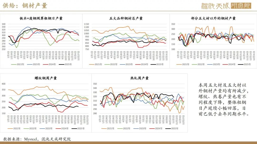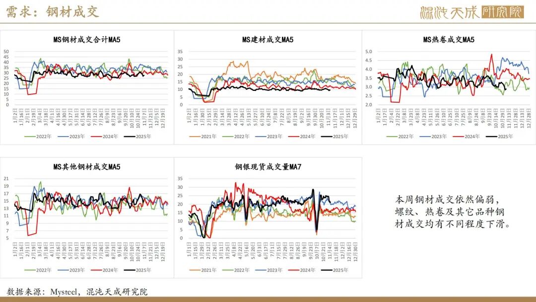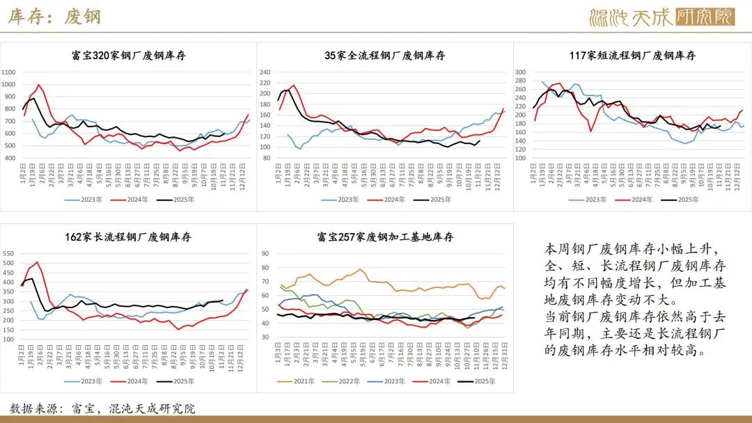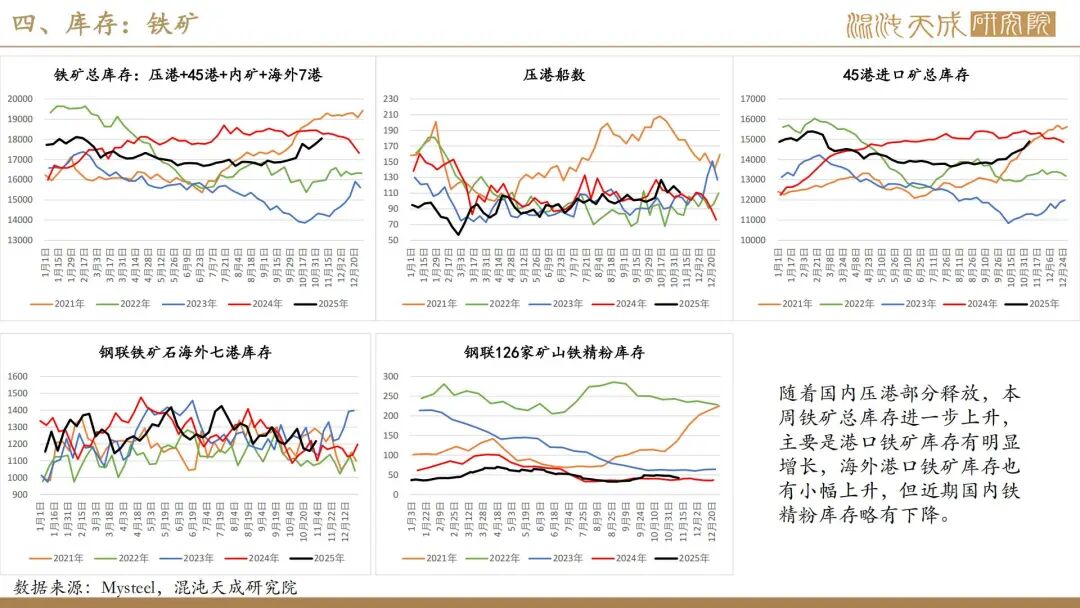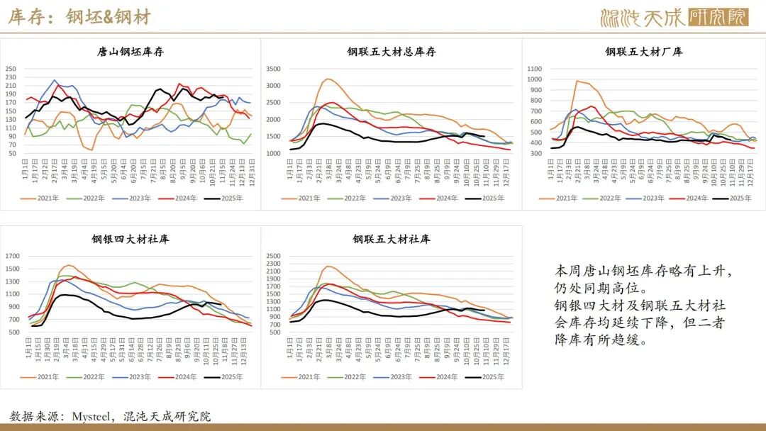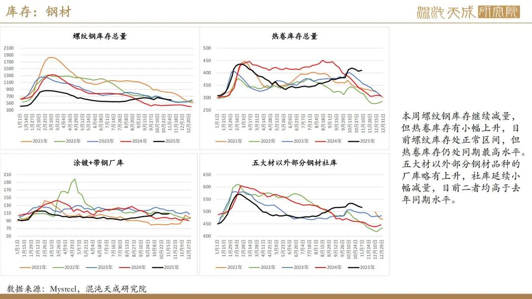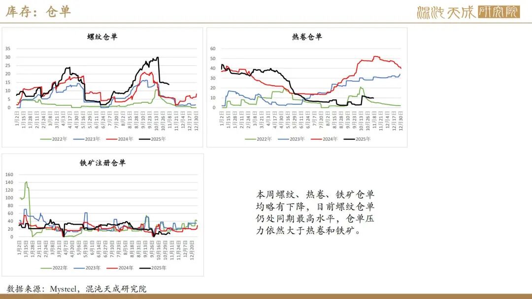 库存:本周疏港略增至320.93万吨,45港铁矿库存大幅上升356.35万吨至14898.83万吨,铁矿总库存进一步增长。同期,废钢库存也有小幅上升,唐山钢坯库存也略有增长,五大材厂库、社库及五大材以外社库虽继续下降但降幅有所趋缓,五大材以外厂库略增,整体钢材库存降幅收窄。