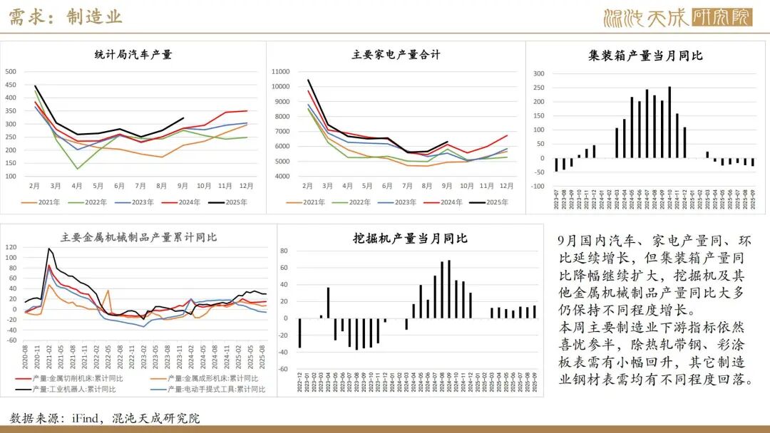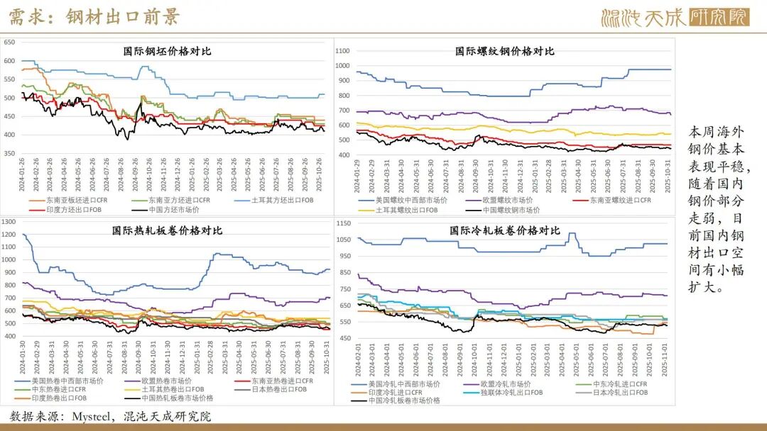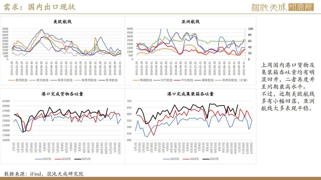 需求:随着钢材市场进入消费淡季,本周建筑业及制造业下游主要高频指标普遍有不同程度下滑,显示钢材需求有所转弱。不过,近期海外钢价多表现平稳,随着国内钢价小幅回落,当前国内钢材出口空间趋增。值得注意的是,近期国内港口货物及集装箱吞吐量再度大幅回升至同期高位,美欧航线虽有小幅回落,但亚洲航线大多表现平稳,显示国内商品出口仍有一定的韧性。