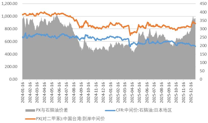 2025年12月中旬以来,地缘政治事件引发原油供应担忧,推动原油价格企稳反弹,为PX市场提供了成本支撑。与此同时,中化泉州80万吨、天津石化30万吨及韩国GS 55万吨等多套PX装置集中停车,市场供需维持偏紧格局,带动PX价格坚挺运行,PXN价差显著回升。相关数据显示,2025年12月26日,PXN价差攀升至376.75美元/吨,较11月底扩大110.92美元/吨,创阶段性高位。
