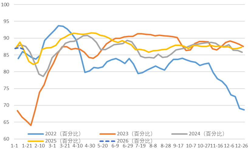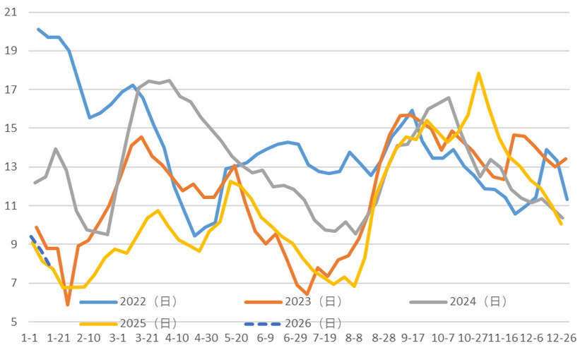 需求端步入传统淡季,终端纺织行业表现疲软。目前国内外服装订单基本交付完毕,仅少量家纺订单处于洽谈阶段。受2026年春节假期偏晚影响,多数纺织企业尚未停工,但生产活跃度显著回落。截至1月16日当周,江浙地区织机开工率降至56.42%,较2025年底下降5.76个百分点;纺织企业织造订单天数仅7.73天,较2025年底减少2.33天。原料端价格坚挺与终端需求不振形成明显背离,直接拖累聚酯产品产销表现,行业库存累积压力持续加大。1月16日,涤纶长丝POY、FDY、DTY库存可用天数分别增至12.8天、17.4天、23.2天,均较去年底及去年同期明显上升。