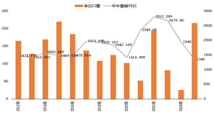 图为钢联口径的2012—2025年国内纯碱出口量和华中重碱现货均价(单位:万吨、元/吨)