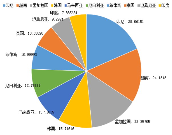 图为海关总署口径的2025年中国纯碱主要出口目的地及出口量(单位:万吨)