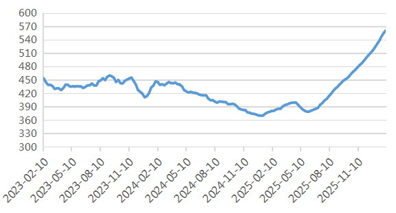 从下游看,2025年我国电解铝总产量4501.6万吨,同比增加101万吨,增长2.4%。数据显示,今年1月国内电解铝产量379.86万吨,环比变动不大,同比增长2.7%。截至1月底,电解铝建成产能4621万吨,运行产能4499.6万吨,企业产能利用率维持高位,且接近“天花板”水平。上周电解铝周度产量达到85.9万吨。