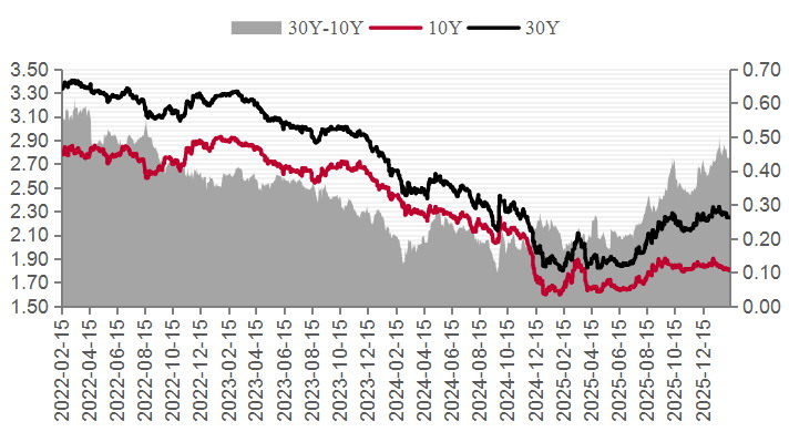 图为30年与10年期国债收益率及利差(单位:%)