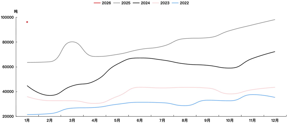 在价格回升与产能周期的双重作用下,碳酸锂市场的供给端呈现出较强的韧性与增长态势。相关数据显示,2025年我国碳酸锂产量累计达到94.4万吨,同比增长约37%,呈现出稳步增长的态势。进入2026年,我国碳酸锂产量环比虽小幅回落,但同比仍实现较高增长。2026年1月,我国碳酸锂产量96200吨,环比减少约2%,同比增长约51%。