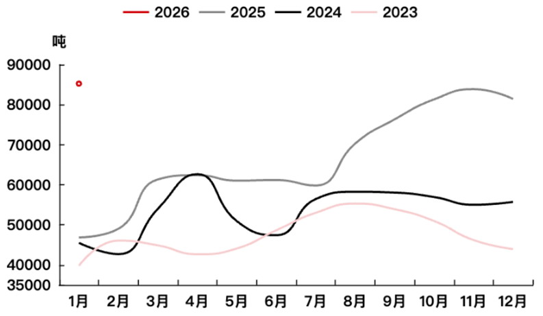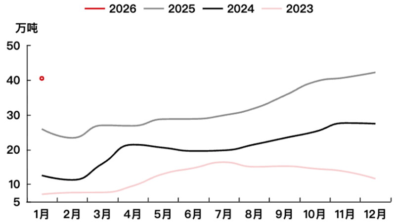 展望2026年,全球锂供应端仍处于产能扩张的周期之中,新项目投产数量可观,整体供应增速预计仍将维持高位。从今年1月至2月的现实情况看,供应端表现较为强劲。尽管春节期间部分企业进行了例行检修或减产,但由于大型冶炼厂保持较高开工率,加之新增产能逐步释放,整体供应量仍处于历史高位。