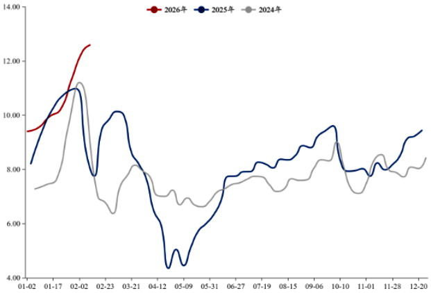 下游库存方面,截至2月13日,全国饲料企业豆粕物理库存天数为12.59天,较上一期增加0.22天,较去年同期大幅增加4.84天。